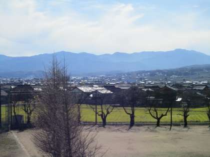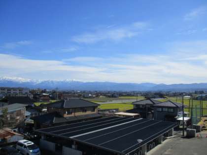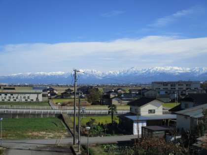 学校から富山平野を望むと、青空に雪を冠した立山連峰が「映え」ています。こんな雄大な風景を見ながら生活できるなんて、とってもすてきですね。 -