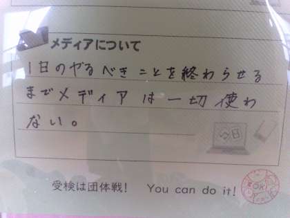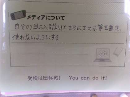 やはりメディアをどれだけコントロールできるかで、家庭学習に集中して取り組めるかが決まってくるような気がします。期末考査もあと1日、体調管理にも気をつけて、頑張れ受検生!