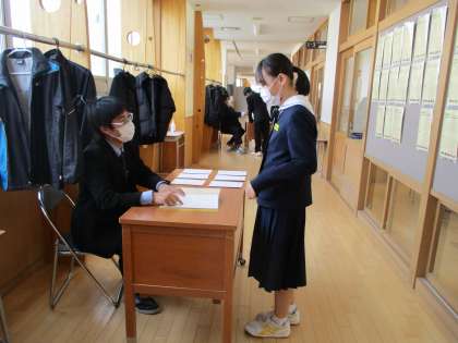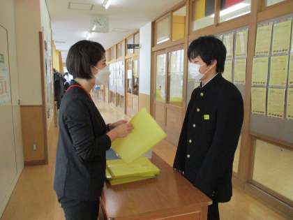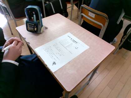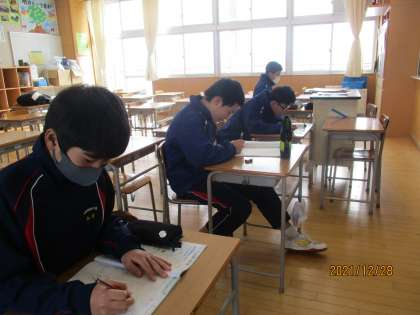 2学期末最後の学級活動です。担任の先生から通知表をもらい、2学期の努力の成果や3学期への課題を一つ一つ丁寧に確認しました。始業式は1月11日ですが、3年生は1月7日が登校日で確認テストが実施されます。プリントを使用して、当日の持ち物や登校時間について最終確認をしました。最後に、17日間の冬季休業が生徒に有意義なものになるよう、担任の先生からの激励の言葉があり、学活を終えました。