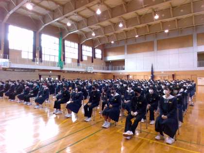 学校長式辞の様子です。生徒は背筋を伸ばして聞いています。