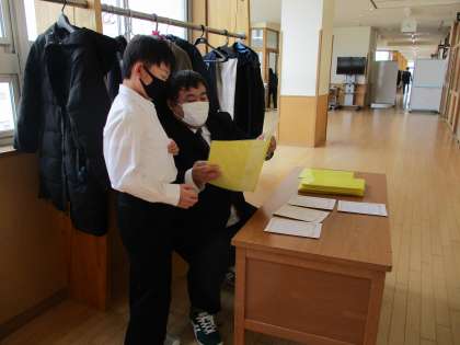1学年の通知表配付の様子です。一人ずつに2学期の頑張りを認めながら配付しています。