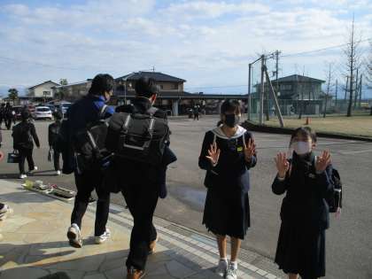 1学年の下校の様子です。暖かな日差しの中、校長先生からの12月のメッセージを心に刻み、2学期終了の帰路につきました。