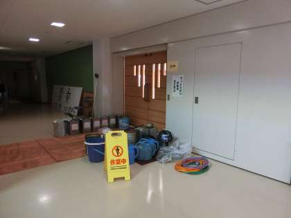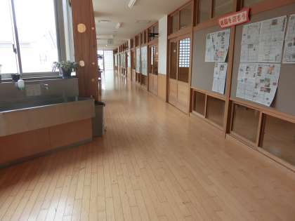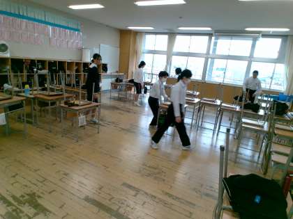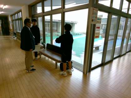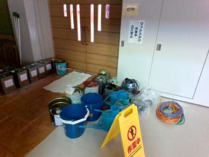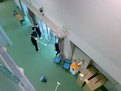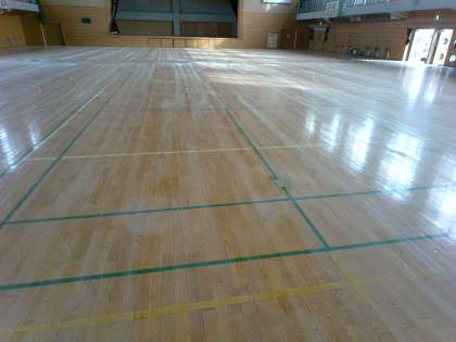 午後は生徒の活動がないため、学校は静まりかえっています。体育館では、ワックスがけの作業が進められています。