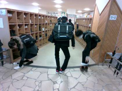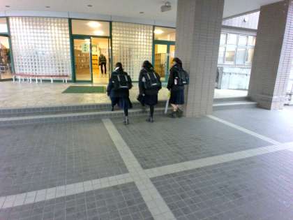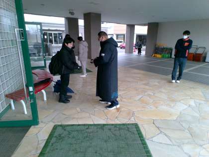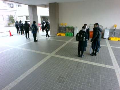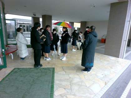 玄関付近では、友人や先生とのいっときの別れを惜しむ姿が見られました。 -
