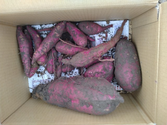 スコップやシャベルを使っての掘り起こし作業。畝の奥底から、大小さまざまなお芋さんたちが出てきました。