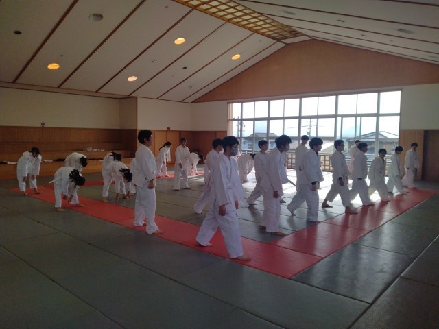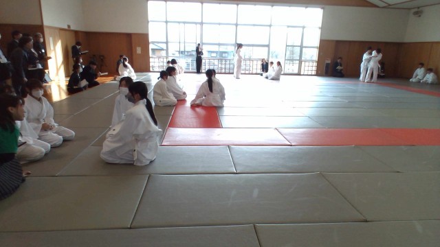 13:30から、武道場で公開授業(3年1組 保健体育 柔道)を行いました。大勢の学校関係者の見守る中、連続技に係る約束練習が始まります。まずは、ウォーミングアップ代わりの受け身から。