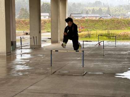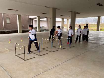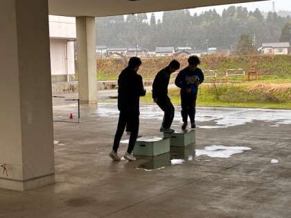 雨が降っていたので、屋根のあるところでドリルやサーキットトレーニングを行いました。 -
