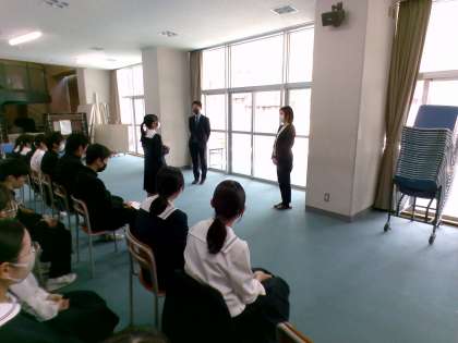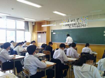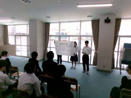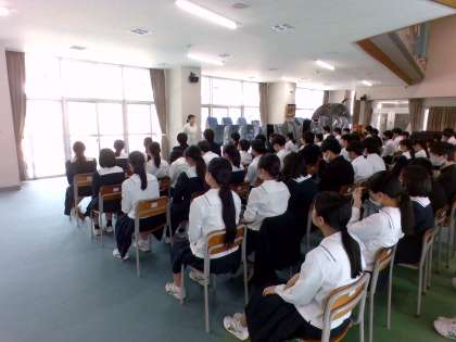 修学旅行に向けた学年集会で、スローガンの発表を行いました。また、修学旅行に同行していただく添乗員の方との顔合わせを行いました。