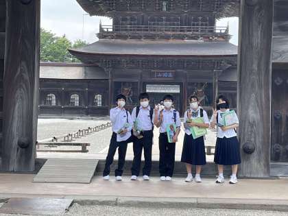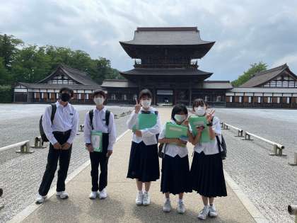 瑞龍寺の前で記念撮影。歴史を感じる佇まいです。