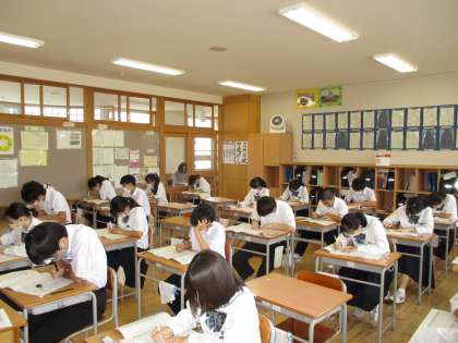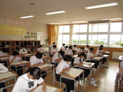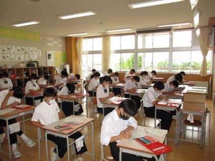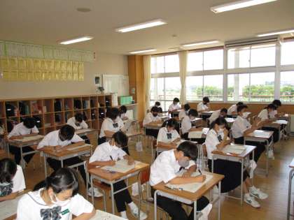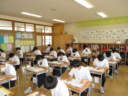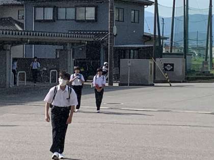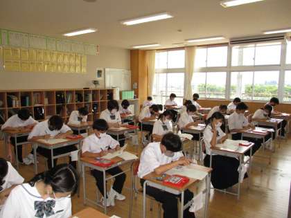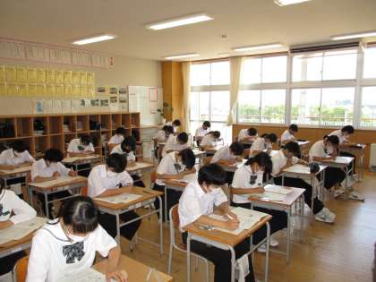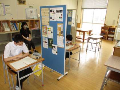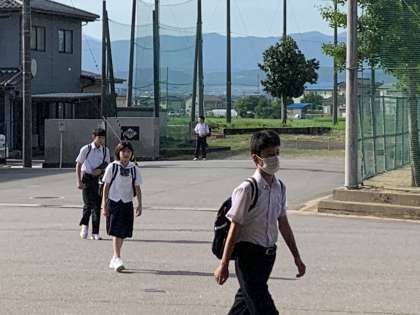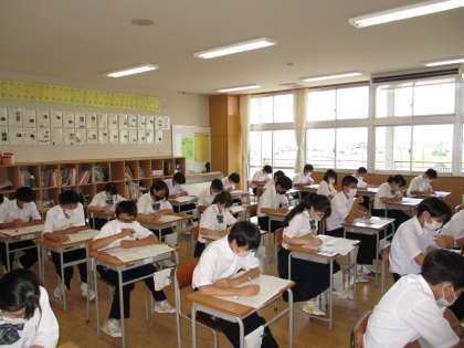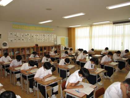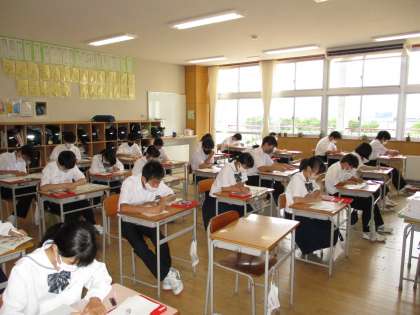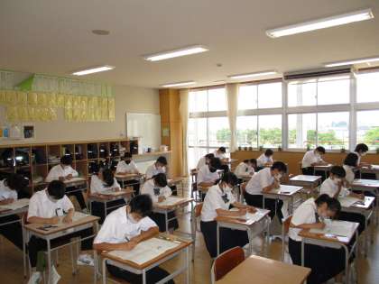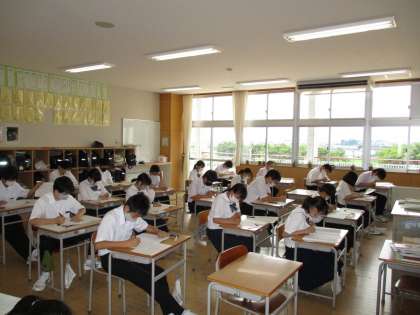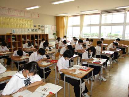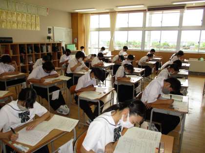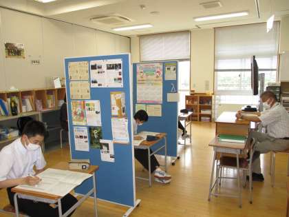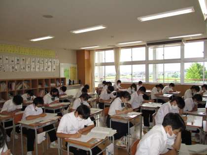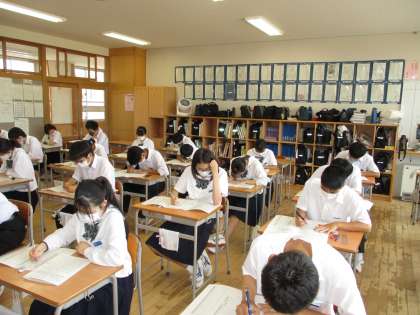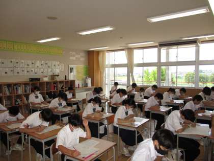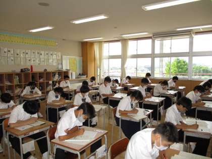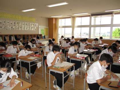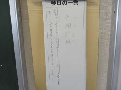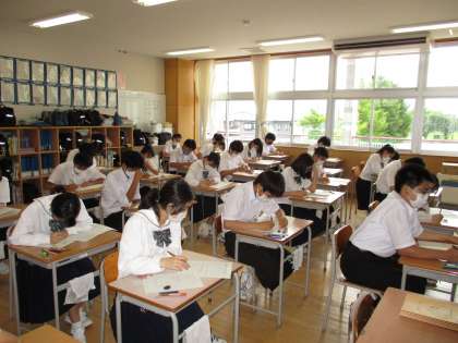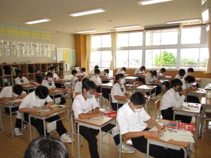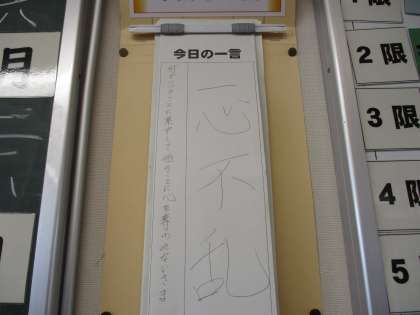 2学年では、日直が「今日の一言」を紹介しています。各クラス、期末考査にふさわしい言葉を伝えていました。