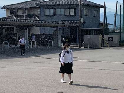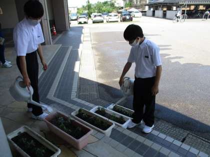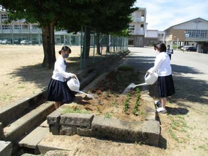 毎日、ボランティア委員が、玄関先のプランターと花壇の草花に水やりをしてくれています。ありがとう!