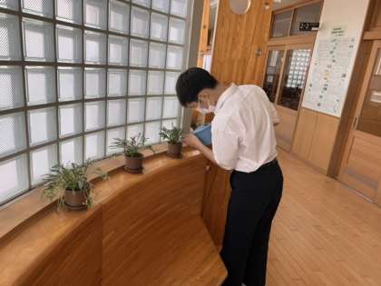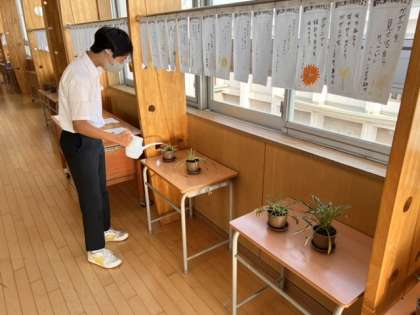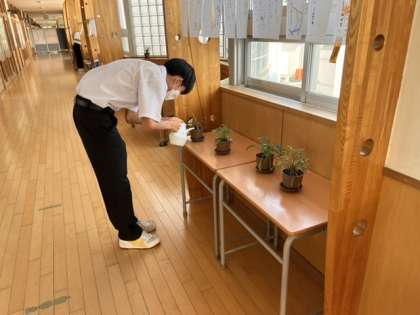 朝早く登校した生徒が廊下のガザニアに水をあげていました。