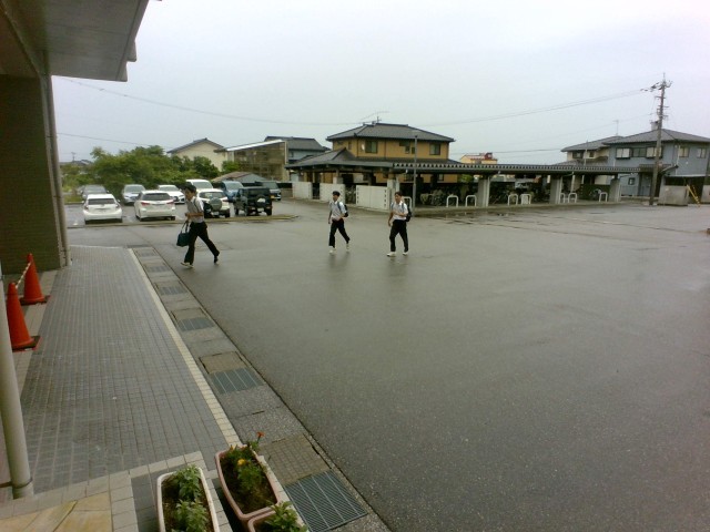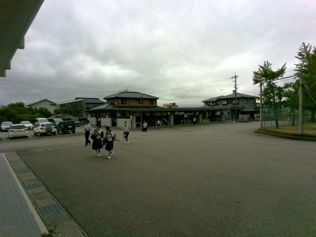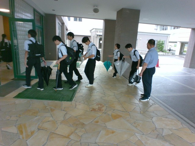 登校の時間帯、空が暗くなり始め、風も強まってきました。しばらく雨天のようですが、下校の頃には止んでくる予報です。