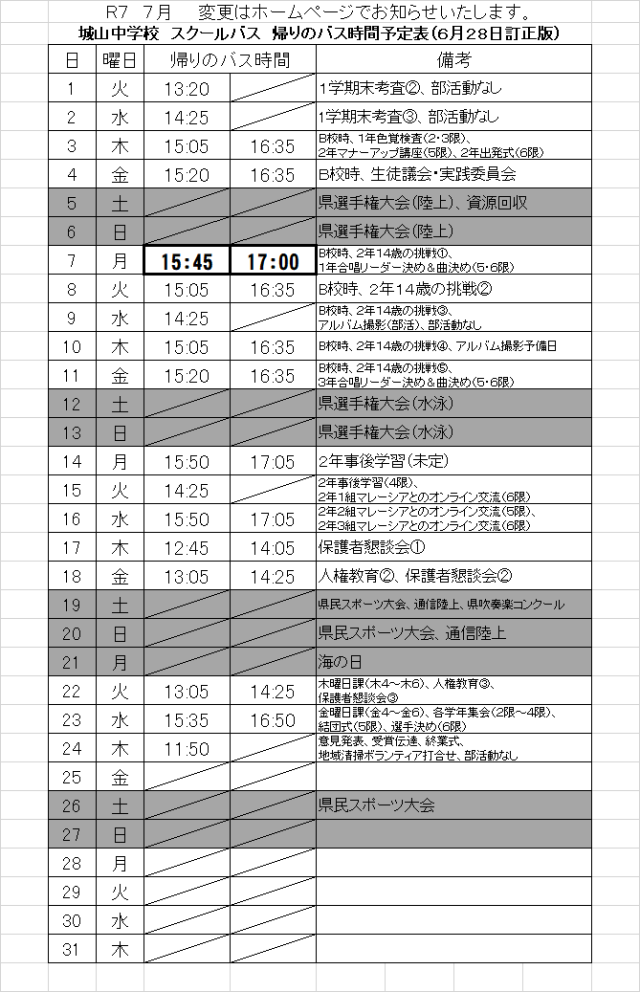 本日は、6時間目の授業終了後、帰りの会を行います(15:05〜)。市民スポーツ大会に向けての部活動(一部生徒のみ)は16:15までとしております。