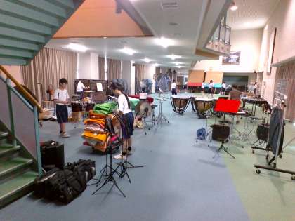 吹奏楽部の様子です。昨日、カーペット清掃が行われたので、多目的ホール等を復旧してからの活動です。