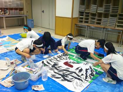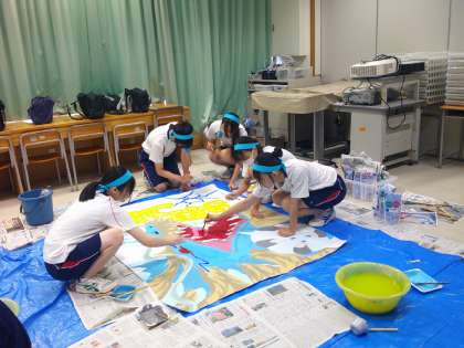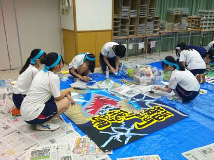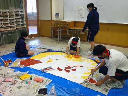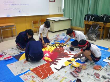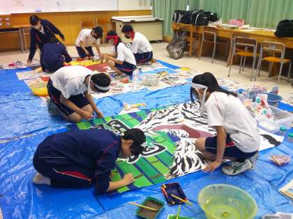今日はどの団も配色を考えながら、塗る作業を進めていました。コミュニケーションが大事なので、生徒は塗る部分をお互いに相談して進めていました。