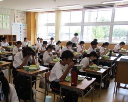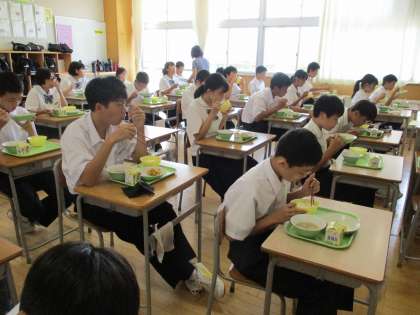感染症対策に一番気をはる給食の時間。どの生徒も「黙準備」「黙食」「黙片付け」で、静かに給食を味わっています。おしゃべりしながらというわけにいかないのが寂しいですが、感染症から身を守りながら、仲間と一緒に美味しい給食をじっくりと味わっています。 -