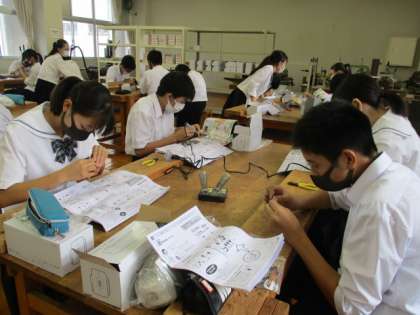 (写真上・中)2年1組 技術でダイナモラジオを作る作業で、部品を取り付けていす。