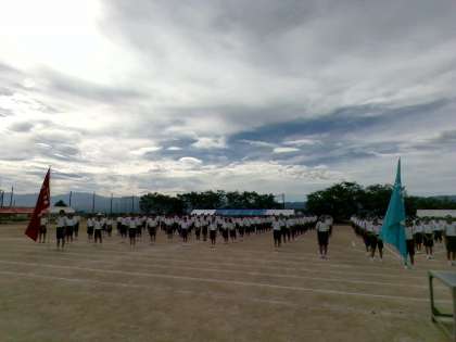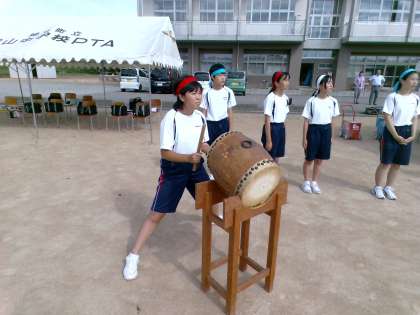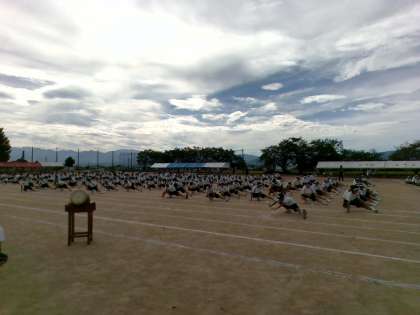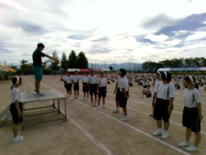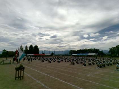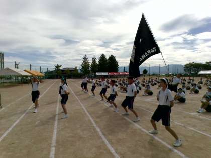 グラウンドで全体練習を行いました。熱中症予防対策を万全に行い、テキパキと進行しました。団練習に入る前に、エアコンの効いた教室でクーリングタイムを取りました。