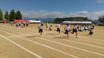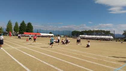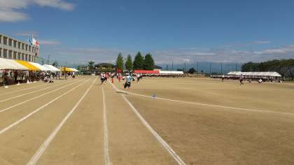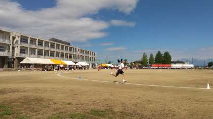 体育大会の華のひとつ、リレーです。まずは学年別選手リレーです。どの団からも声援がおくられています。