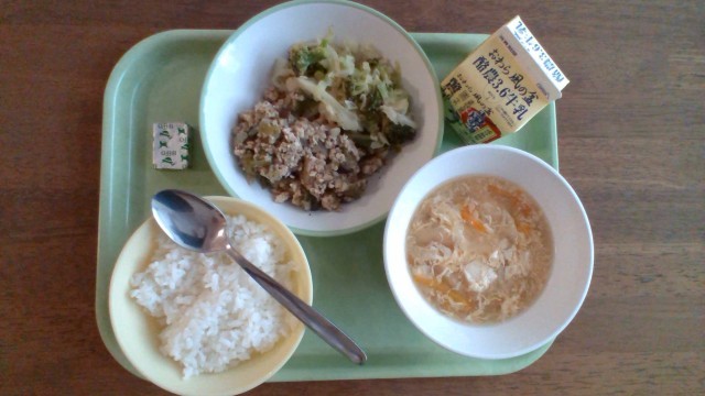 【本日の献立】 とやまのえごま入りガパオライス レモンサラダ 卵スープ ポケットチーズ MILK