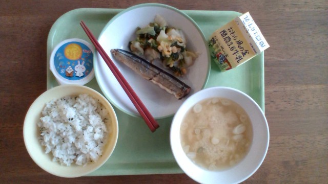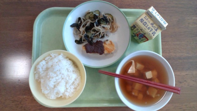 【本日の献立】 さばの竜田揚げ ごま和え 豚肉の炒め煮 RICE MILK