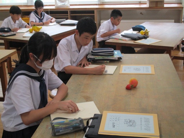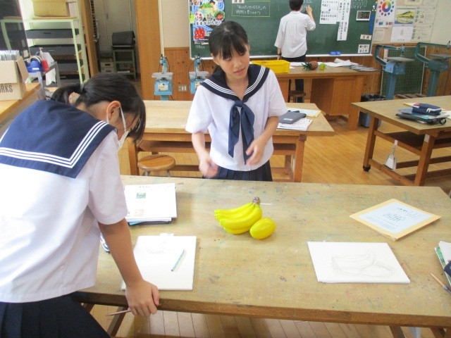 授業の最初に、ウォーミングアップとして、身の回りにある物をデッサンしました。よく観察し、鉛筆の持ち方や力の入れ方を変えながら濃淡を表しました。また、授業の後半には、「私の大切なもの」の課題に取り組むため、各々が大切にしている部活動の道具や長年愛用しているもの等の特徴を出し合いました。