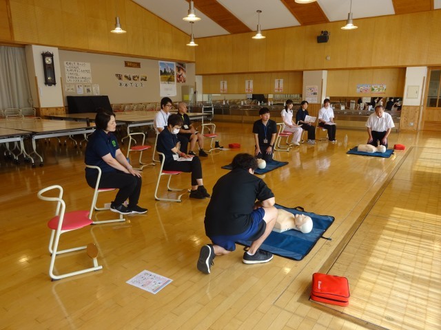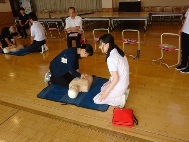 教職員研修として、日本赤十字社の方から救命講習を受けました。部活動等による重大な事故に備え、心肺蘇生やAEDの使用について確認しました。