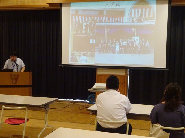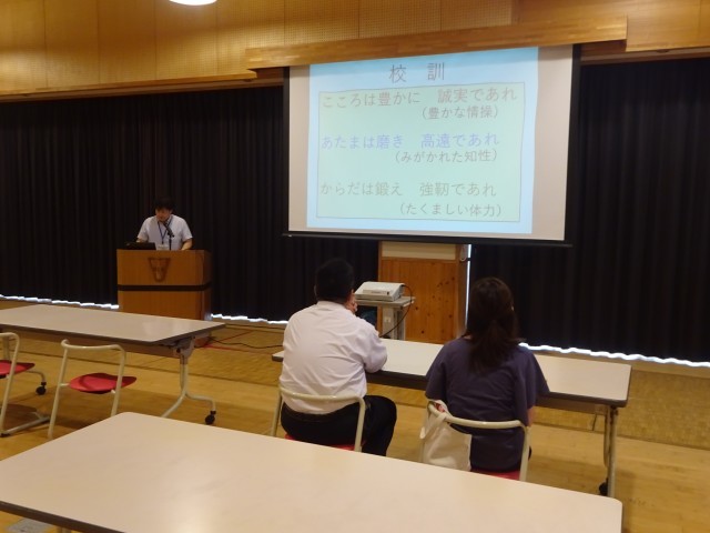 校長の挨拶と教務主任による学校概況説明の様子です。