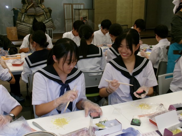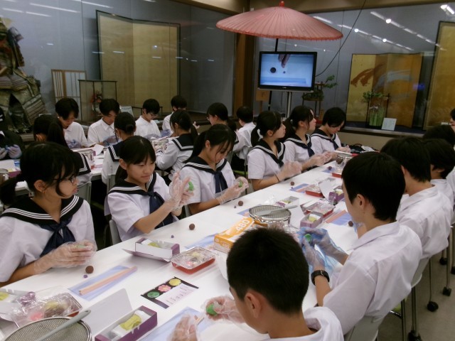 [10月2日(木) 1・2年生合同金沢校外学習 和菓子作り体験学習の様子]