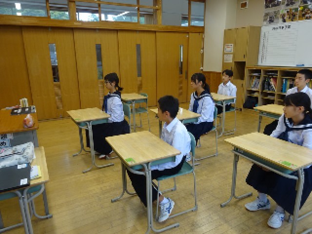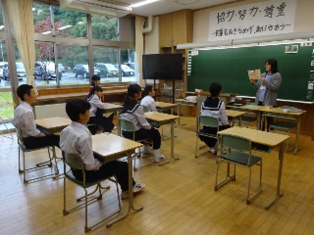 今週から始まった「秋の読書週間」に合わせ、山田図書館の司書さんをお招きし、おすすめの本を紹介していただきました。1年生の生徒たちは紹介された本に興味を示しながら、真剣に話を聞いていました。明日は2年生で行われる予定です。