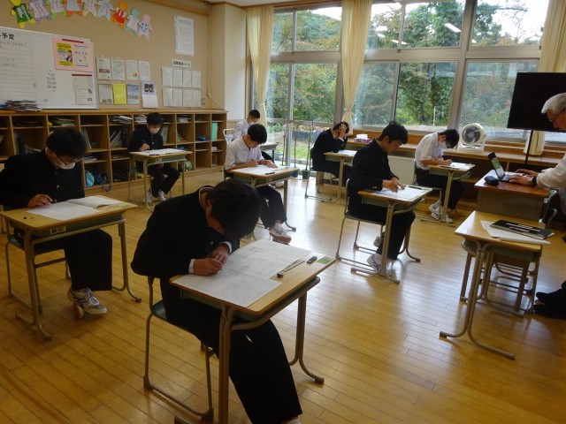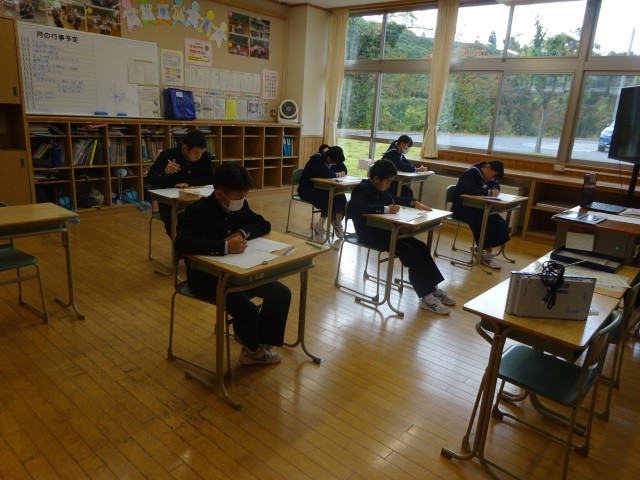 中教研学力調査1日目の様子です。これまでの学習がどれくらい理解できているかを確認します。どの生徒も50分間粘り強く取り組んでいます。