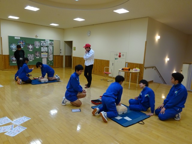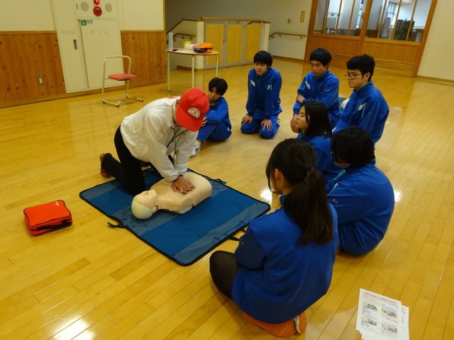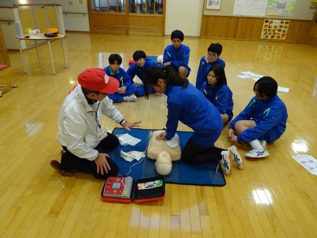 心臓マッサージの仕方やAEDの使用方法について学習しました。万が一に備える生命を守る大切な体験活動です。