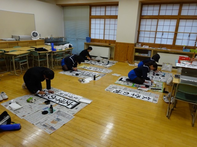 2年生の習字の様子です。揮毫課題「文学の地」の練習をしました。普段のにぎやかな様子から一転、落ち着いた様子で筆を揮いました。