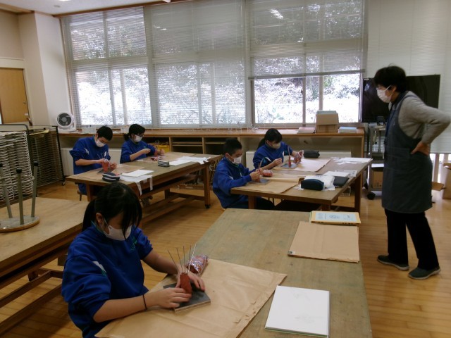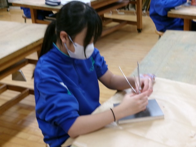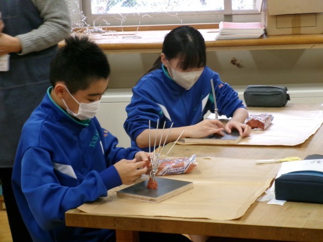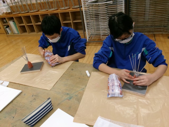 「手」の制作に取り組みました。自分の気持ちを手で表現していきます。心棒を使って表したい形に合わせ、粘土を付ける作業を行いました。心棒全体に粘土を付け、大まかな手の形にしていきます。