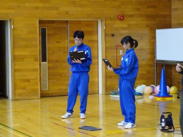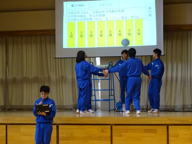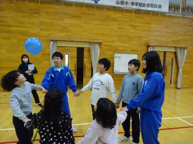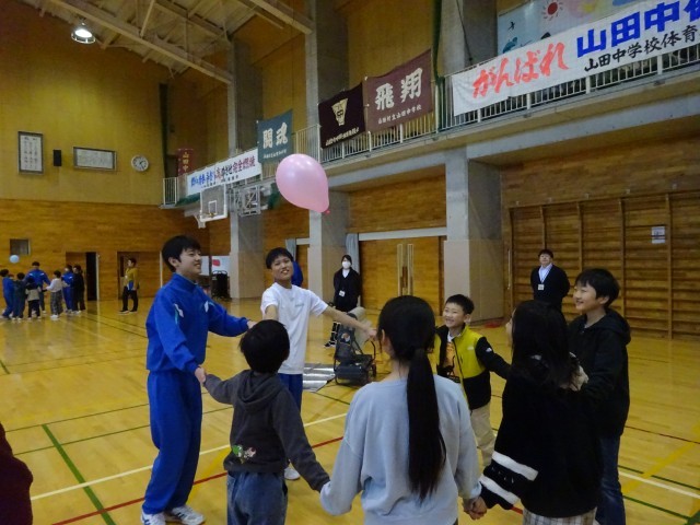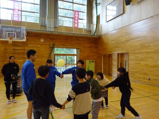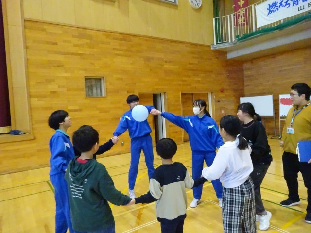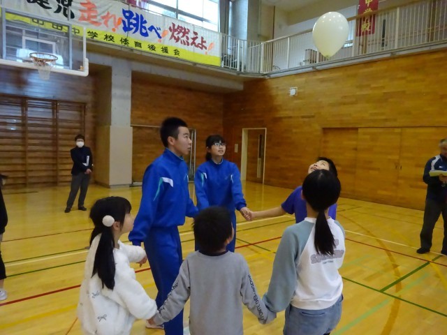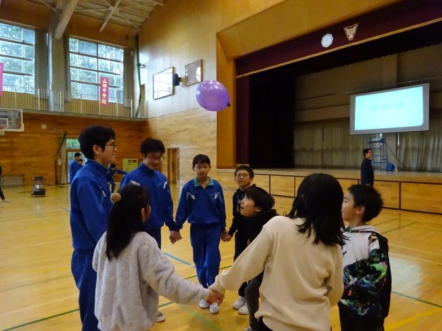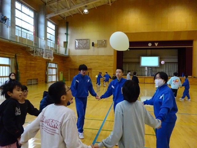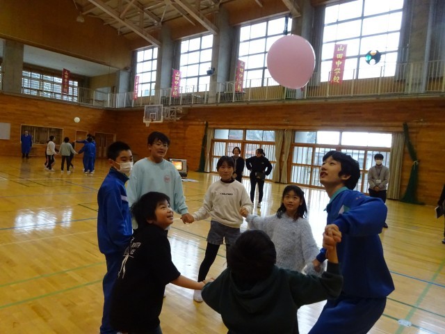 12月15日(月) 5限 小中合同集会① 公開日 2025/12/15 更新日 2025/12/15 生徒会 本日5限は小中合同集会でした。中学校生徒会執行部が主体となって企画し、2つのゲームを行いました。写真はゲーム①風船バレーをしているときの様子です。どのチームも協力しながら風船を落とさないようにつないでいます。 +7