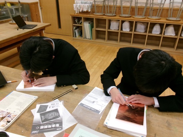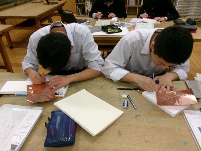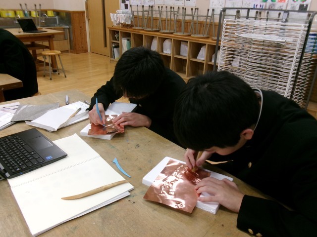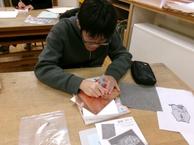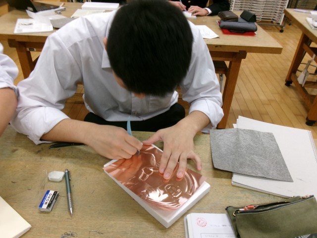 銅板に下絵を写し、ヘラを使っておうとつを付けていきます。
