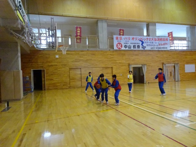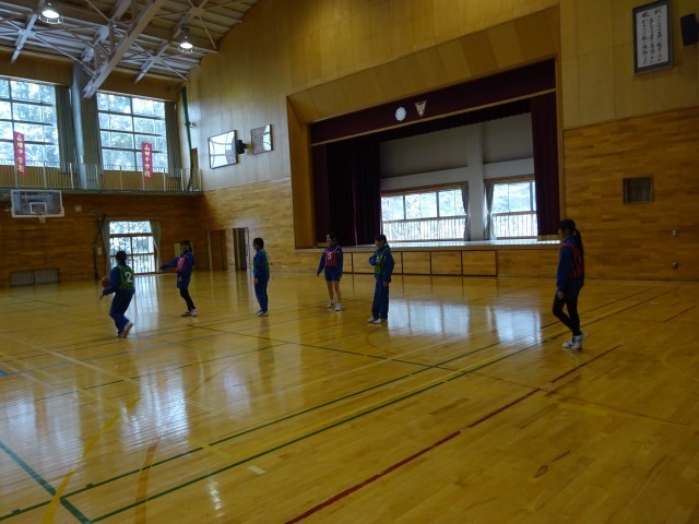 1、2年生が合同でバスケットボールに取り組みました。男子、女子に分かれて、試合形式での練習を繰り返しました。