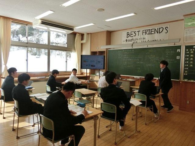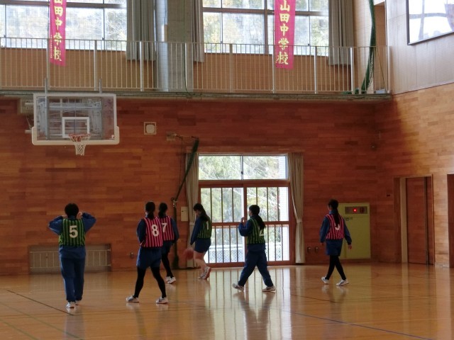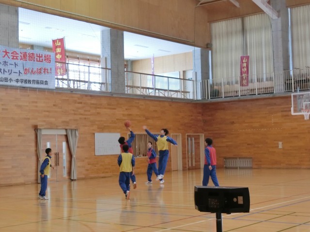 本日4限の授業の様子です。1、2年生は合同体育(バスケットボール)、3年生は社会(国際社会と私たち)の授業に一生懸命取り組んでいました。