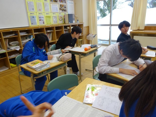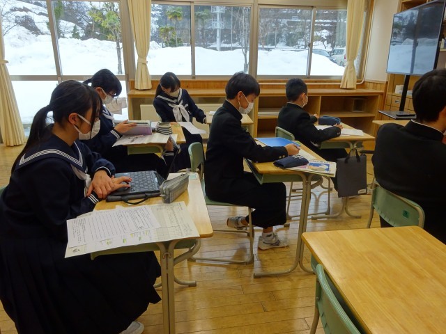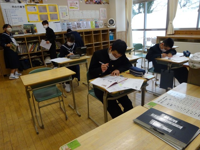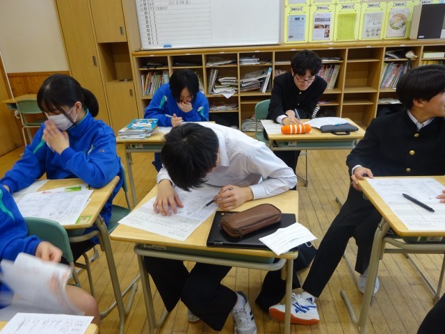 5限 3年生は美術です。卒業に向けて最後の作品を作成中です。1、2年生は期末評価に向けて、学習計画を立てています。学年最後のテスト、悔いのないように努力します。6限は1、2年生合同体育のようすです。ウォーミングアップ後、バスケットボールを楽しんでいました。