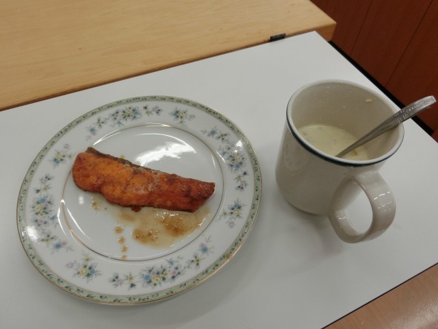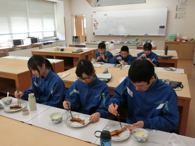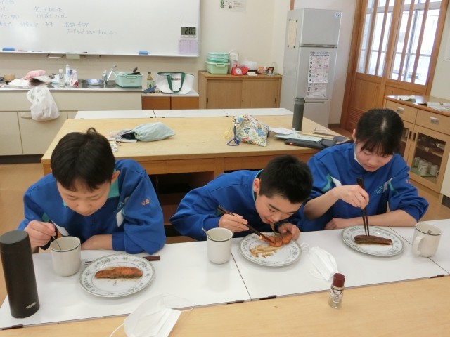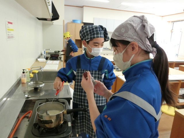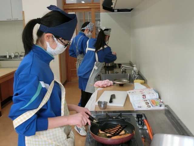 2月24日の2・3限に今年度最後の調理実習を行いました。鮭のムニエルとコーンスープを作りました。仲間と協力し、手際よく実習を行うことができ、大変おいしく作ることができました。