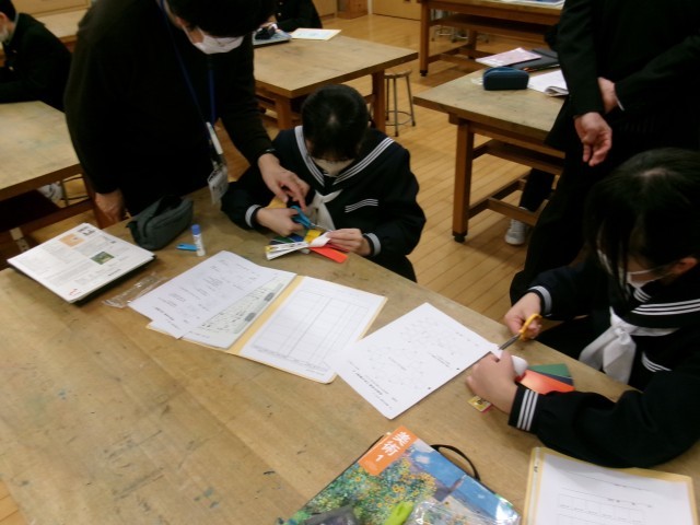 前回に引き続き、色彩について学習しました。配色カードを使い、色の三原色や色味の似ている順に色を並べた色相環をつくりました。