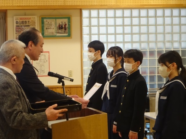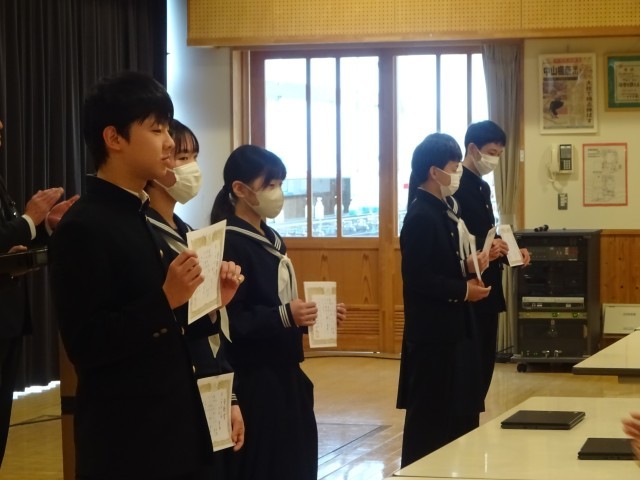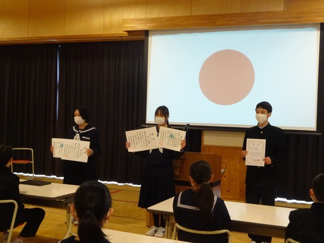 美術展や書写展覧会、書初め大会の受賞報告と皆勤賞授与式が行われました。