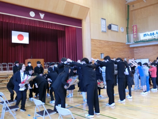 本日は小中合同離任式でした。先生方から最後の挨拶をいただき、生徒からもこれまでの感謝の言葉を伝えました。やわらかな晴れ空の下、あたたかい式となりました。山田小・中学校から転出される先生方の新天地でのご活躍をお祈りしています!