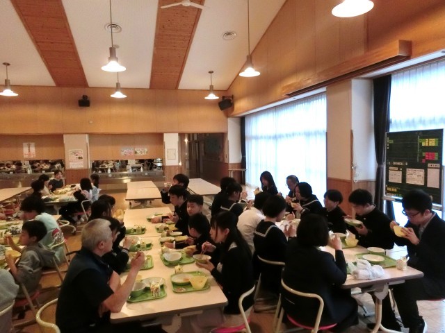 今日から給食が始まりました。今年度はランチルームで小学生と共に食べています。久しぶりのおいしい給食を味わって食べていました。