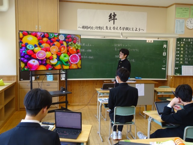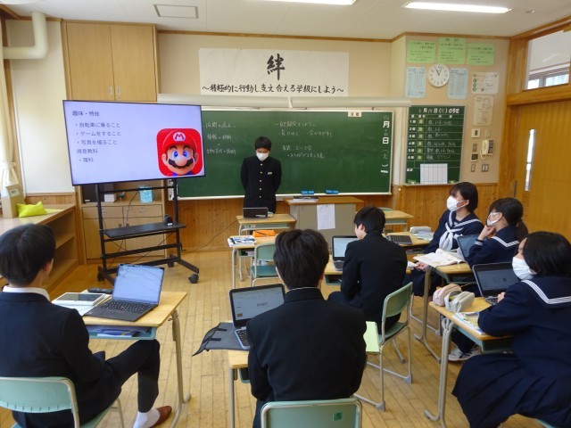 自己紹介のスライドを作成し、発表しました。文字を大きくしたり、画像を入れたりしてスライドが見やすくなるよう工夫しました。