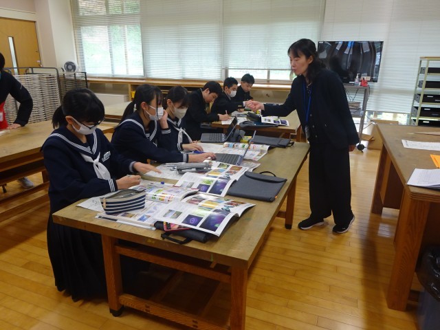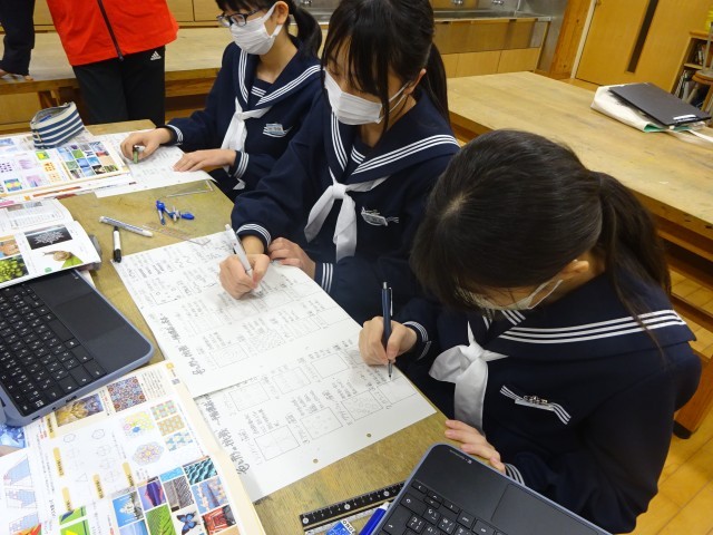 美術の授業です。「平面構成」の基本を学びました。「シンメトリー」や「グラデーション」等のデザインを考え、プリントに描きました。