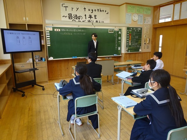 相手にわかりやすく情報が伝わる工夫について学習しました。アンケートフォームや、シャンプーボトルのきざみ等を例に、情報の伝わりやすさについて学びを深めました。