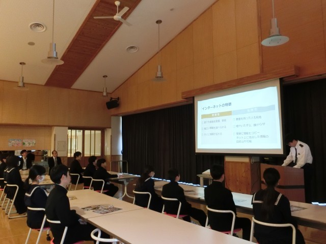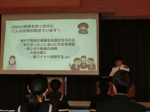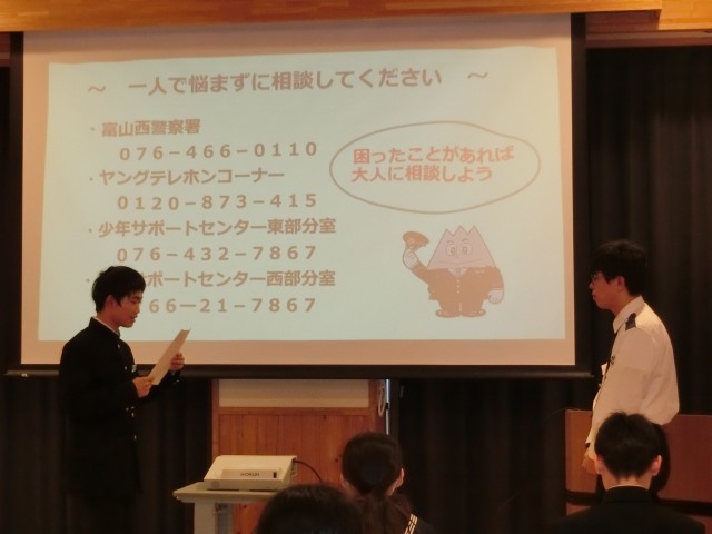 富山西警察署山田警察官駐在所の浅井様をお招きしてSNSの正しい使い方や自転車運転に関するルール等について講演していただきました。