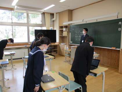 1年生の学校生活が今日から本格的に始まりました。初めての朝学活は、少し緊張した様子でした。